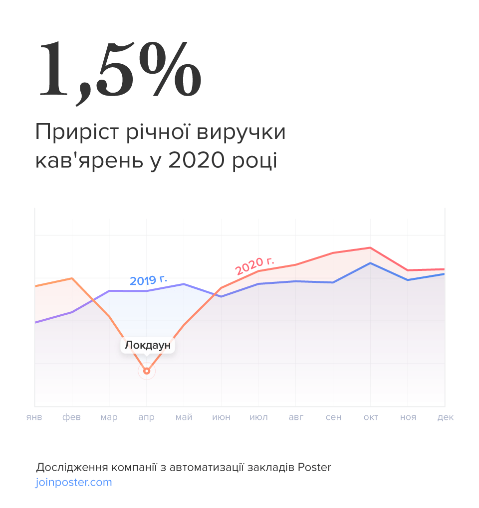 Виручка українських кав’ярень в 2020 році зросла на 1,5% в порівнянні з докризовим 2019 роком. Найскладнішим періодом для власників кав’ярень виявилася весна 2020 року. Локдаун приніс спад виручки на 24% в березні, на 74% в квітні і на 35% в травні в порівнянні з колишніми значеннями 2019-го.