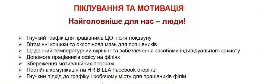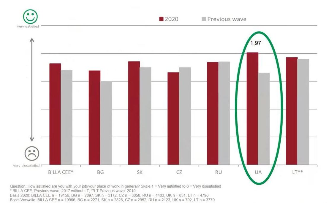 В результаті вже в вересні 2020 го, коли проводилося опитування задоволеності роботи персоналу в різних країнах, де представлена Billa, український підрозділ показав найвищі результати. Причому задоволеність умовами праці значно зросла відносно 2019 року.