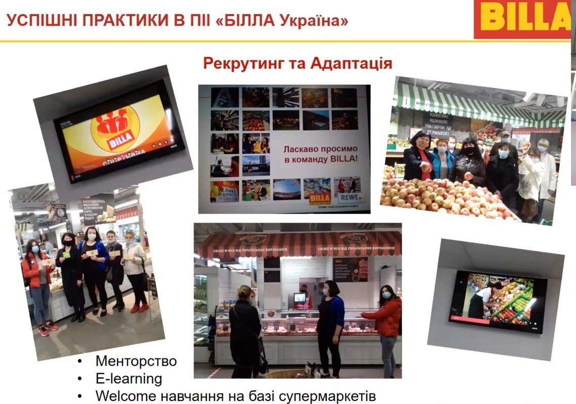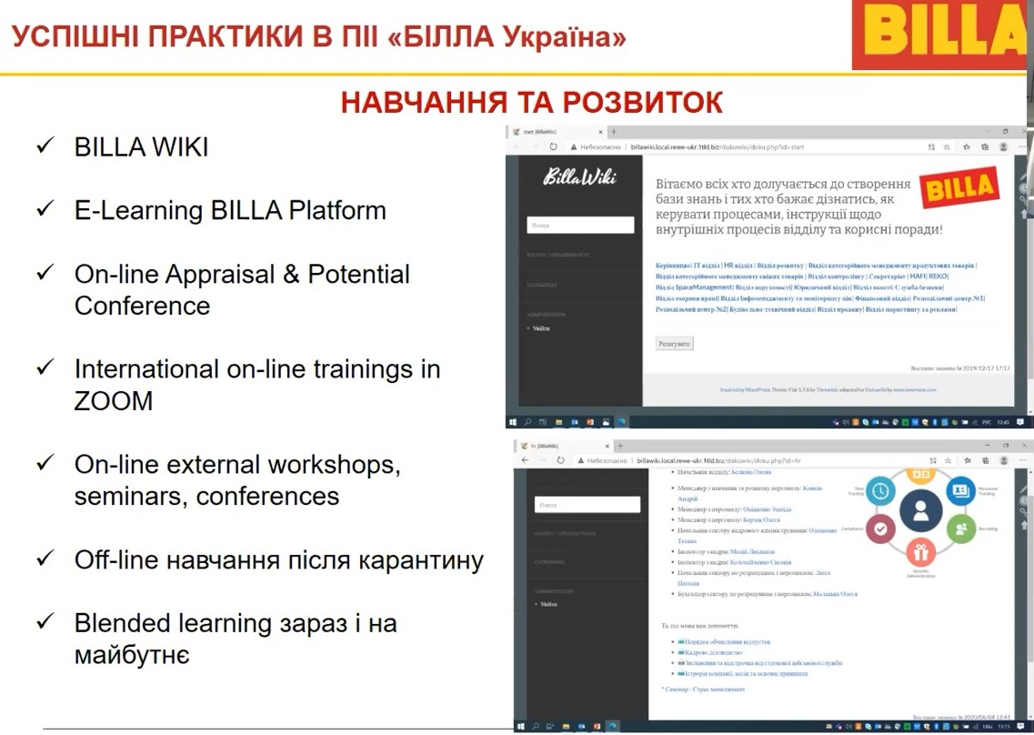 В ході RAU-вебінару «Вплив пандемії на корпоративну культуру компанії» Олена Бєлкіна, Head of HR Department Billa Україна, поділилася досвідом успішного впровадження інновацій в корпоративну культуру компанії для ефективного подолання кризових ситуацій. Зокрема, успішні практики ПІІ «BILLA Україна» включали в себе трансформацію HR-процесів, системи мотивації працівників, особливості роботи та комунікації в режимі Home Office.