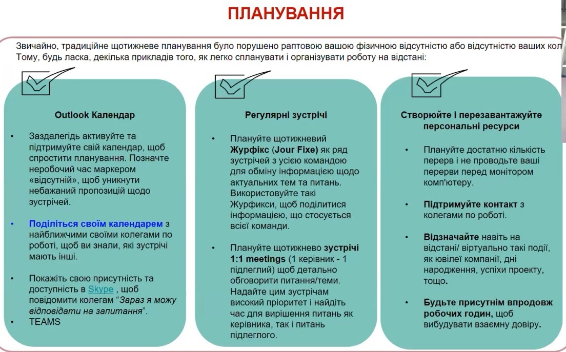 Були також розроблені спеціальні рекомендації для співробітників, що дозволяють так організувати робочий процес, щоб працювати без перевантажень і організовувати віртуальні зустрічі в зручний час. Наприклад, обов’язково влаштовувати перерви і чітко встановлювати тимчасові рамки робочого дня.