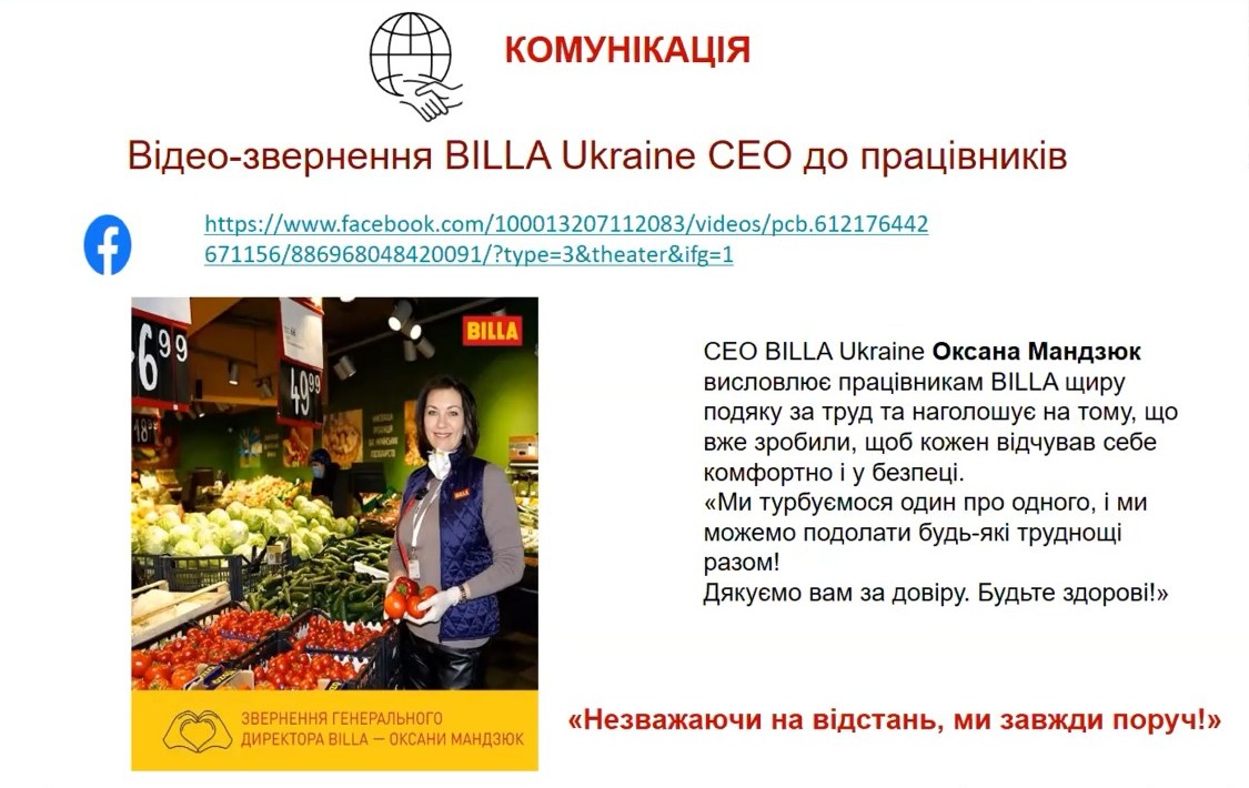 Невеликі знаки уваги можуть мати великий ефект. Так, співробітники філій, які перебували «на передовій», повинні були відчувати постійну підтримку головного офісу, який працював віддалено. Тому генеральний директор Billa Ukraine Оксана Мандзюк записала відеозвернення до співробітників.