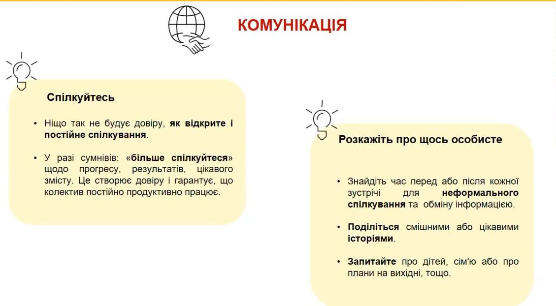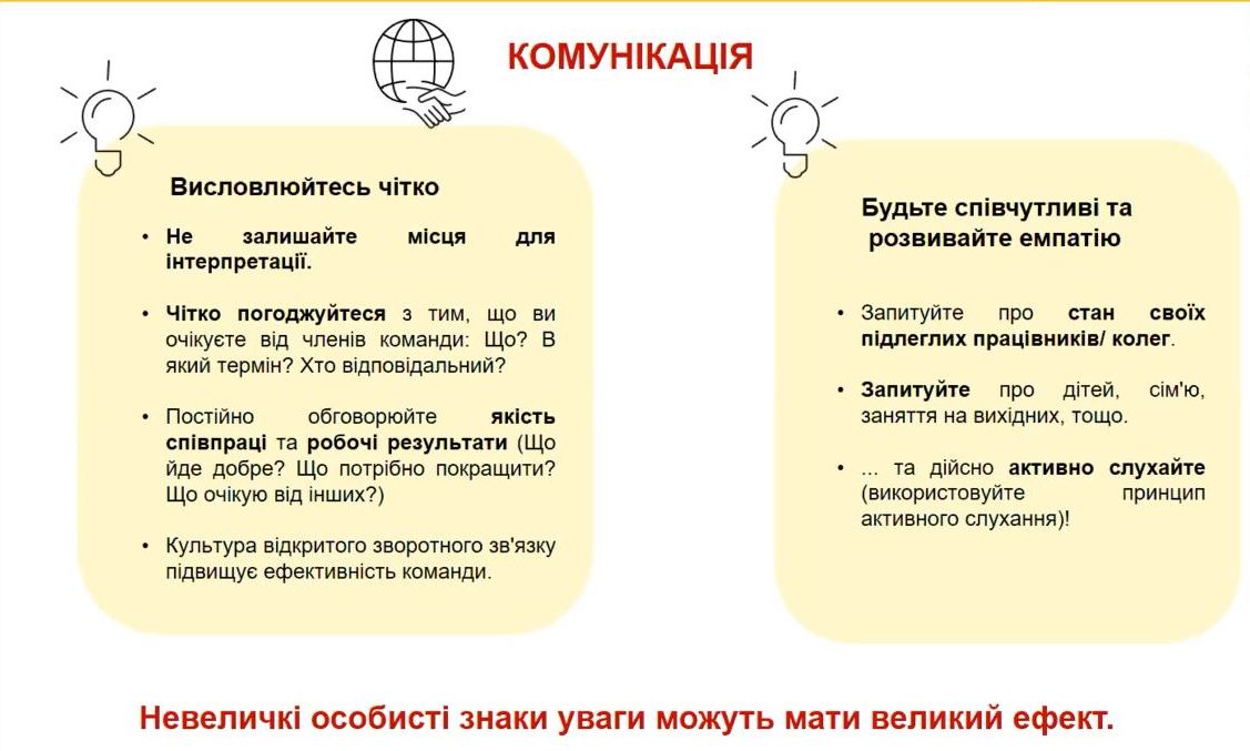 По-перше, керівники повинні довіряти співробітникам. По-друге, слід мати чітку комунікацію, в тому числі і для того, щоб зрозуміти, наскільки правильно співробітник зрозумів поставлене завдання. Нарешті, важливий навик емпатії. Це один з ключових навичок лідерів і керівників.