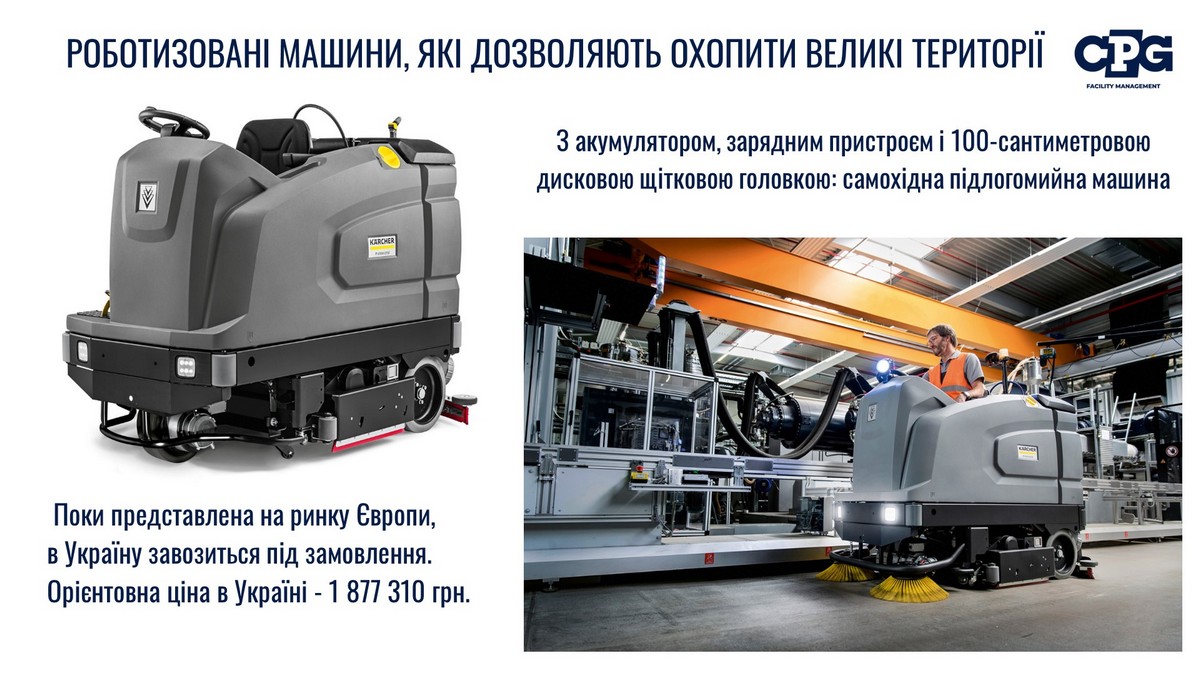 В України такого поки що немає, але з часом вони неодмінно з’являться. Як-от роботизовані машини, що дозволяють охопити великі території, на кшталт самохідної підлогомийної машини з акумулятором, зарядним пристроєм і 100-сантиметровою дисковою щітковою головкою.