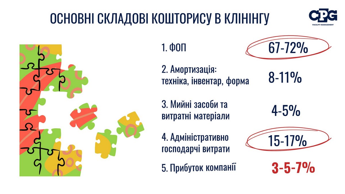 Найбільш вагома складова вартості послуг у клінінгових компаніях – це фонд оплати праці персоналу й податки на нього (67-72%). Близько 8-11% складає амортизація техніки та спеціального інвентарю, спецформи працівників тощо. Ці два фактори – люди й техніка – найбільше впливають на якість наданих послуг. Наприклад, лінійний персонал – це справжній «золотий ресурс», що наразі в дефіциті на ринку. Так само від стану та можливостей техніки буде залежати кінцевий результат прибирання.