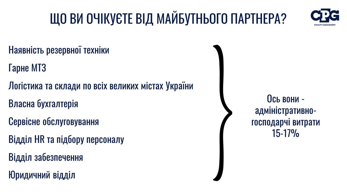 Для забезпечення витратними матеріалами та іншими засобами мають бути відповідні склади і налагоджена логістика по всій країні. Тому компанія має два центральних офіси (у Києві та Львові) з філіалами у Дніпрі та інших великих містах. Не можна віддавати на аутсорс послуги бухгалтерії, юридичного відділу чи HR-відділ. Тому й виходить, що в загальному кошторисі витрати на забезпечення роботи компанії складають 15-17%. І якщо цю частку зменшувати, наприклад, до 12%, постраждає сервіс та якість виконання послуги. Тому недарма великі компанії-замовники перед укладанням договору командирують представників своєї служби безпеки аби пересвідчитися, що мають справу зі справжнім бізнесом, а не конторою з офісом у квартирі та технікою в сусідньому гаражі.