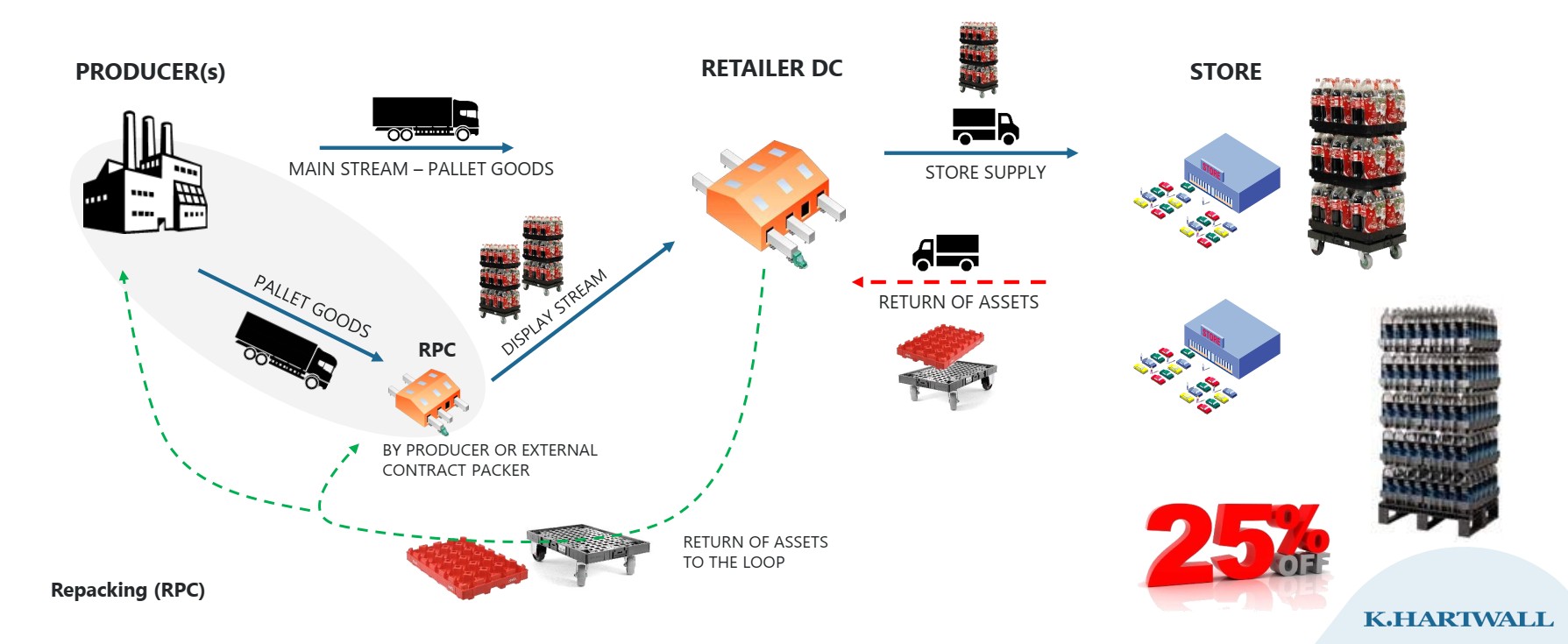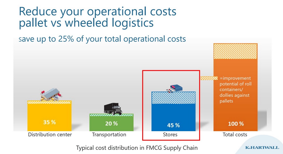 Фахівці K.Hartwall запропонували знизити операційні витрати на логістику за рахунок використання спеціальних пристроїв Merchandising units and Displays (MU/Displays). Вони являють собою заздалегідь заповнені товаром «полиці на колесах», які можна легко транспортувати і встановлювати прямо в торговому залі. Ще їх називають Eurodolly (дослівно – євровізок).