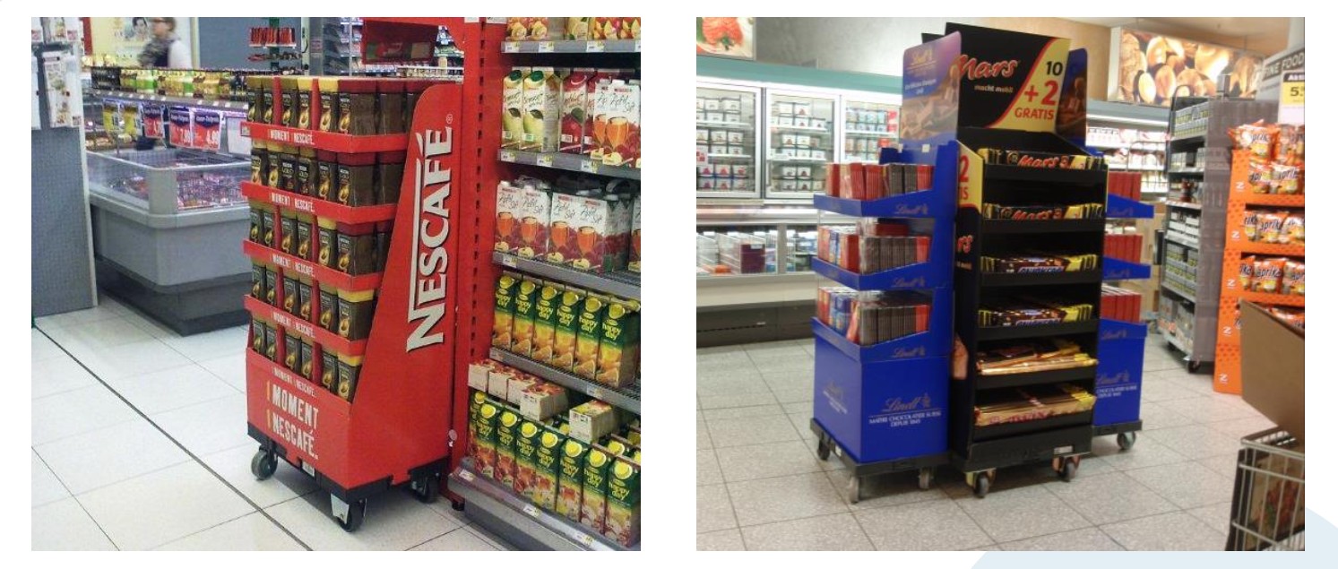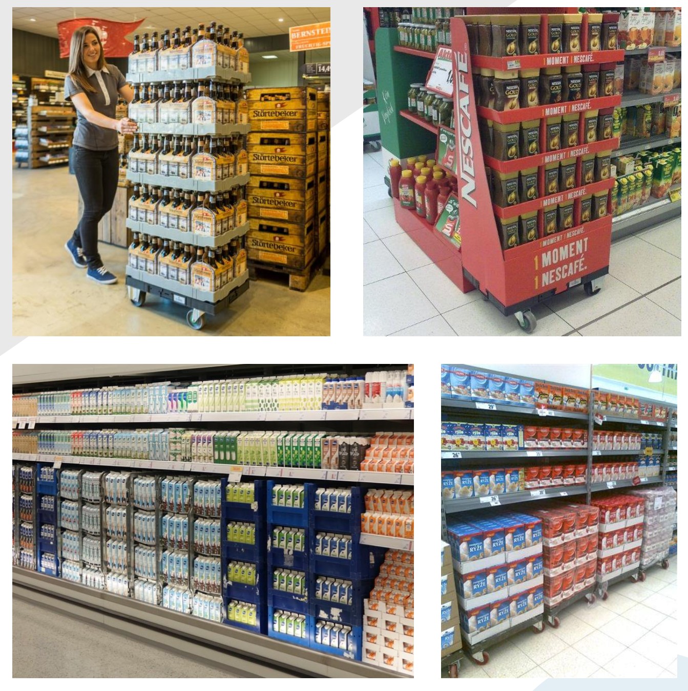 Використання візків для демонстрації товару дозволяє швидко розміщувати їх в торговому залі і при необхідності легко змінювати конфігурацію. Хороша видимість і доступ до продукції, а також безпеку розташування товару на таких дисплеях вже оцінили покупці. Як показує практика, при правильному розташуванні товару в торговому залі продажі можуть вирости до 400%.