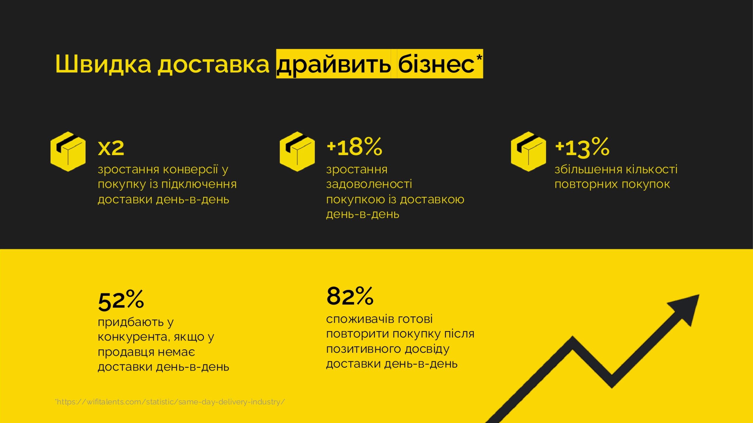 За міжнародними дослідженнями, які релевантні й для України, 80% покупців хочуть доставку день в день, 61% з них хочуть якнайшвидше, 88% готові доплатити за доставку день в день, а 47% не завершать покупку, якщо компанія не запропонує їм доставку в цей же день.
