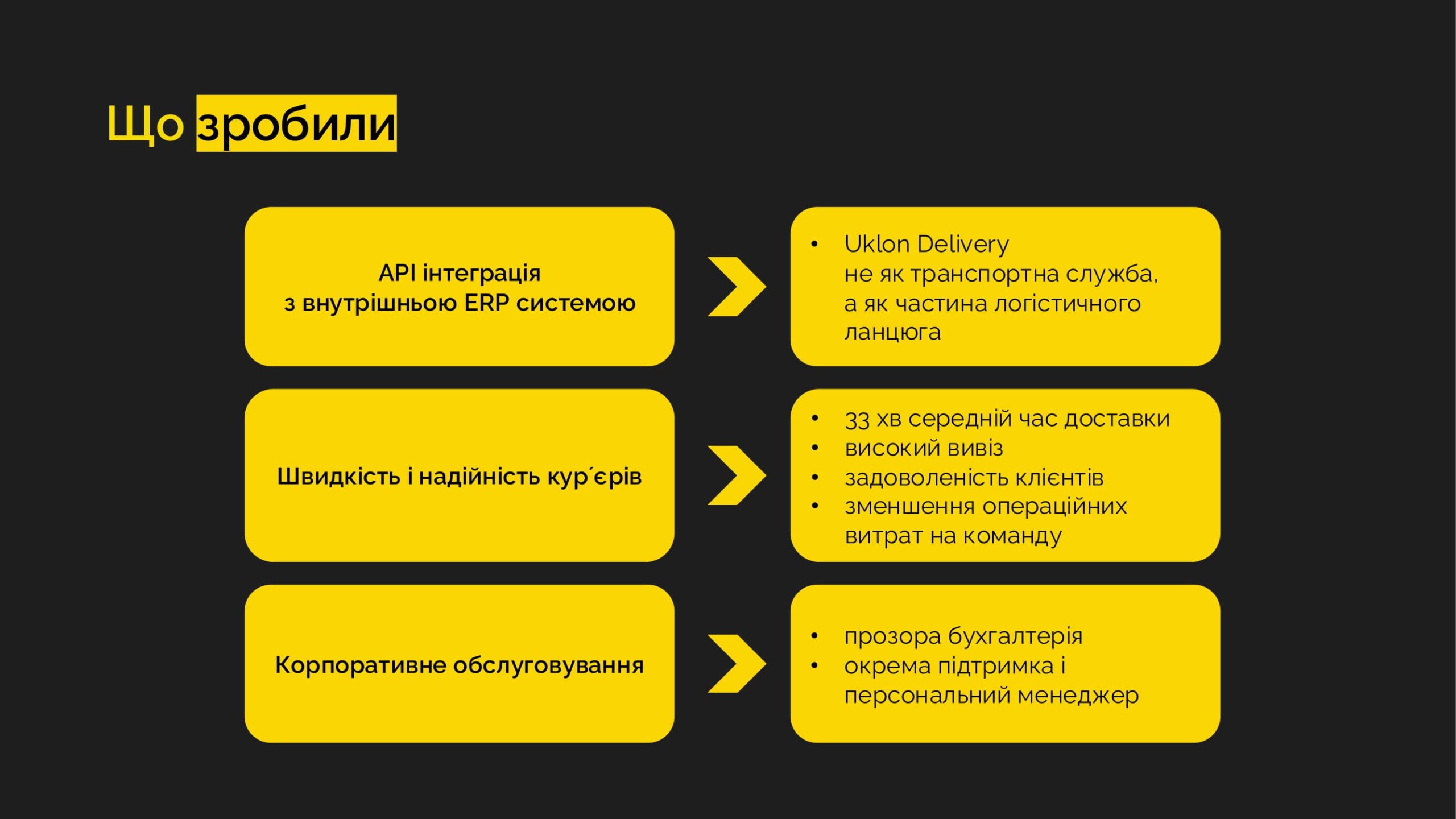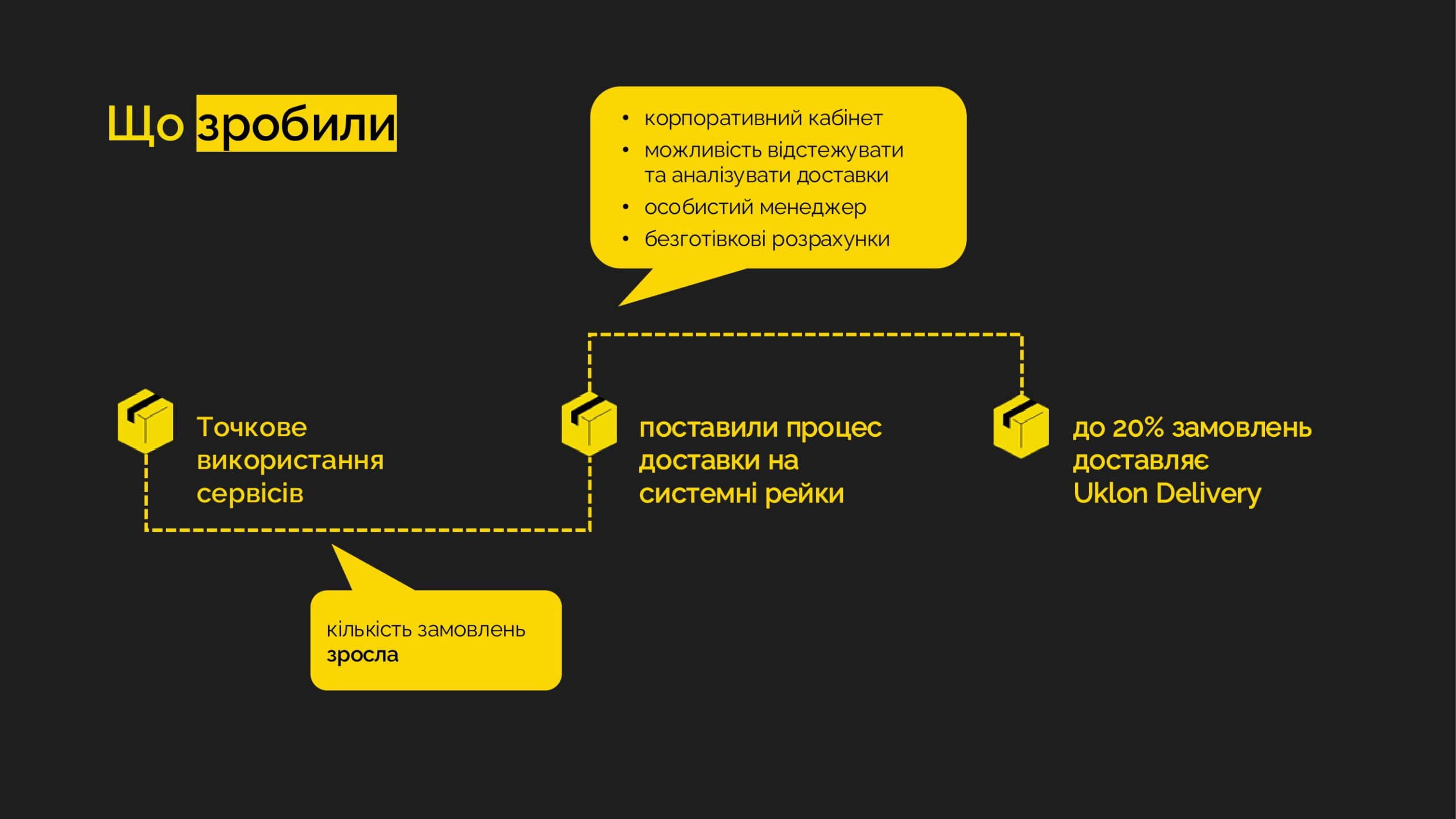 Тож у колаборації з Uklon Delivery поставили процес доставки на системні рейки: зробили корпоративний кабінет, з’явилася можливість відстежувати та аналізувати доставки, є особистий менеджер та безготівкові розрахунки.