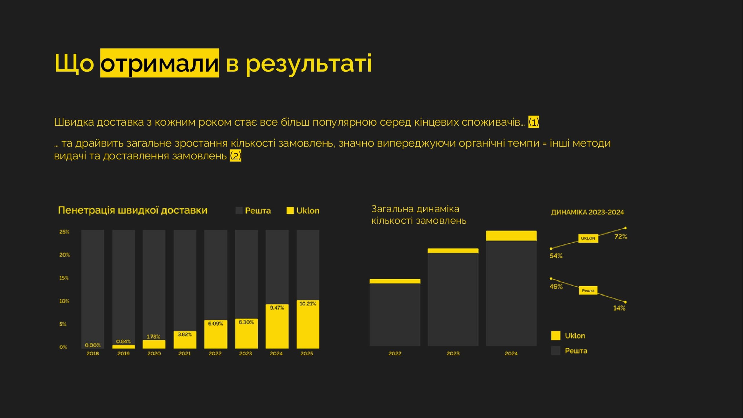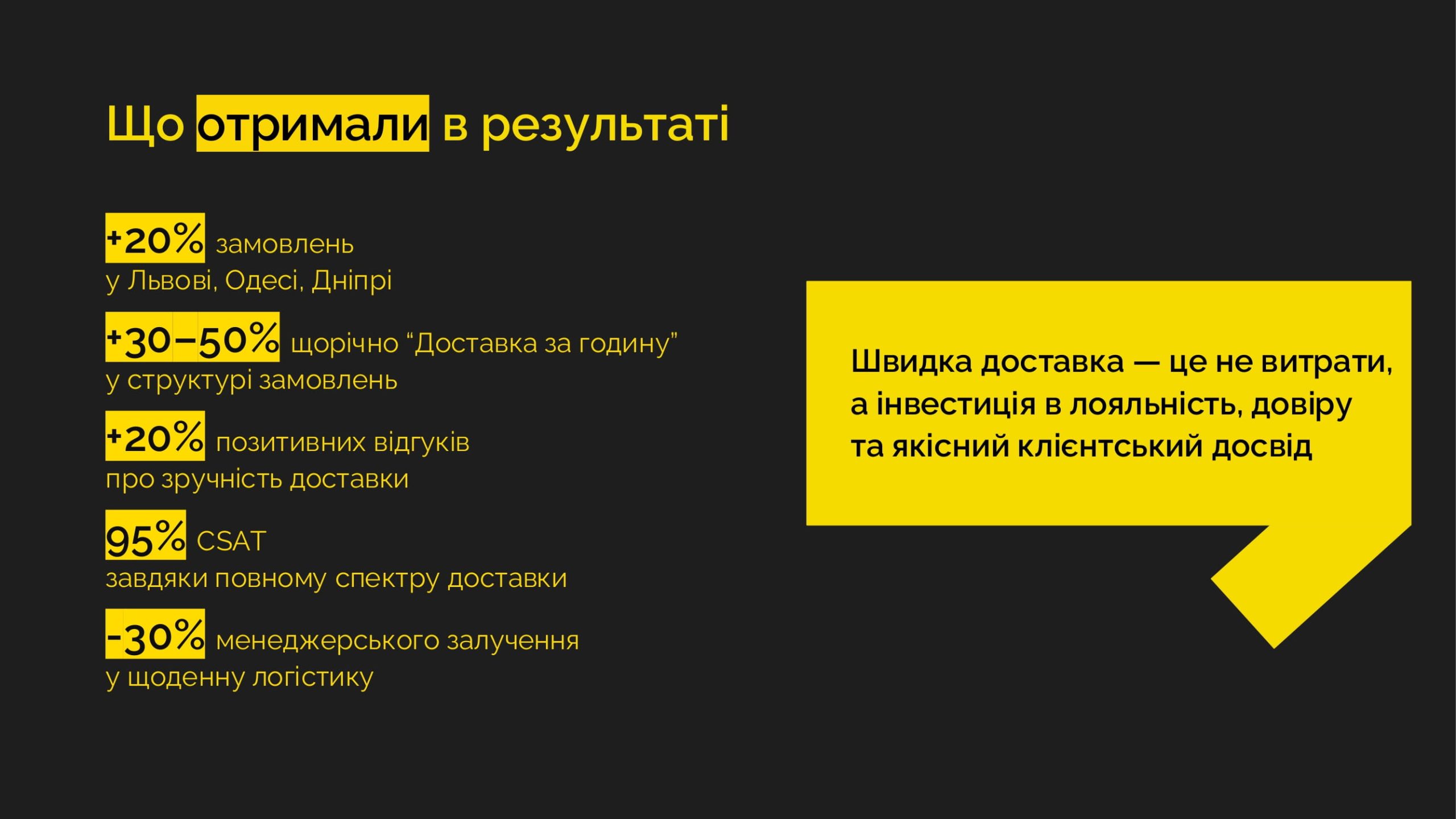 Як результат – 20% замовлень доставляє Uklon Delivery. Ця співпраця дозволила зробити швидку доставку однією з визначних конкурентних переваг компанії. Завдяки спроможності вчасно задовольнити клієнта, конверсія у виконане замовлення становить майже 100%. А використання сервісу Uklon Delivery є економічно та операційно вигідним рішенням на противагу власній доставці.