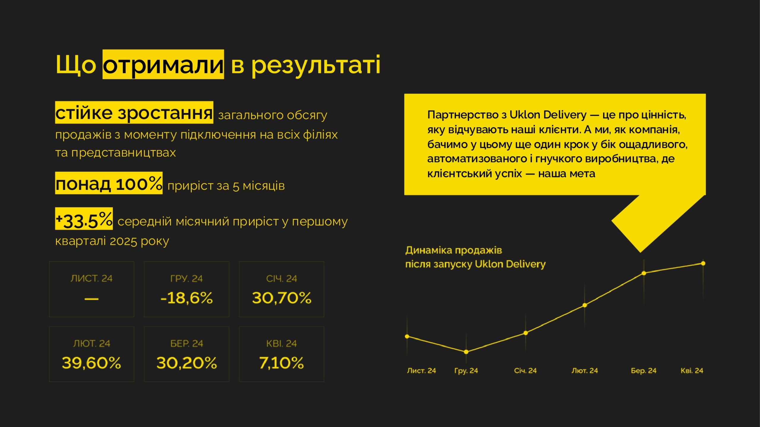 Тож у партнерстві з Uklon Delivery інтегрували швидку доставку за одну годину, забезпечили 24/7 доступність навіть у пікові періоди, перенесли частину логістики на Uklon Delivery для гнучкого балансування ресурсів та поступове масштабування на всі інші міста присутності.