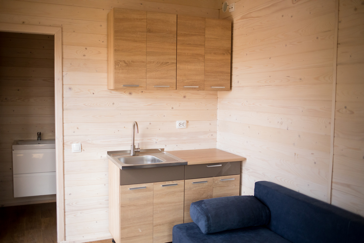 Модульний будинок обладнаний двомісним диваном, шафою, міні-кухнею, санвузлом, кондиціонером (для охолодження та обігріву) та вентиляцією. Після підключення комунікацій (водо- та електропостачання) людина може комфортно проживати.