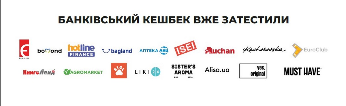 Кешбек разом із нами вже затестили такі компанії як Книгарня Є; Bomond (online), hotline.finance, Bagland, АНЦ, Auchan, Kachorovska, Euroclub, ISEI, Knigoland, Liki24, Alisa, Yes, original, Agromarket, Bigl UA, Sister’s Aroma, Must Have та інші.
