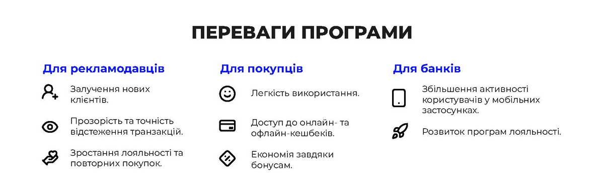 - Залучення нових клієнтів. Банківські кешбек-програми сприяють приверненню уваги аудиторії з високим рівнем довіри до банків, а також стимулюють нові покупки;