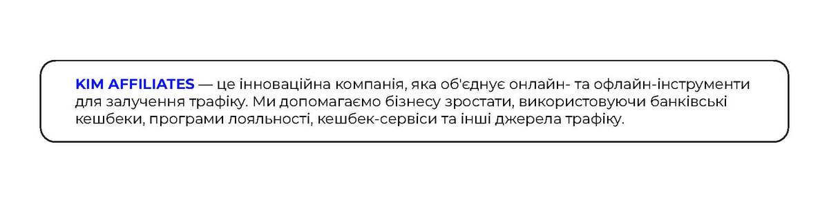 KIM Affiliates — це компанія, яка використовує інноваційні підходи для залучення трафіку, об’єднуючи онлайн- та офлайн-інструменти. Основна місія — створити ефективні стратегії для розвитку бізнесу клієнтів, залучаючи нових покупців через банківські кешбеки, програми лояльності та кешбек-сервіси.