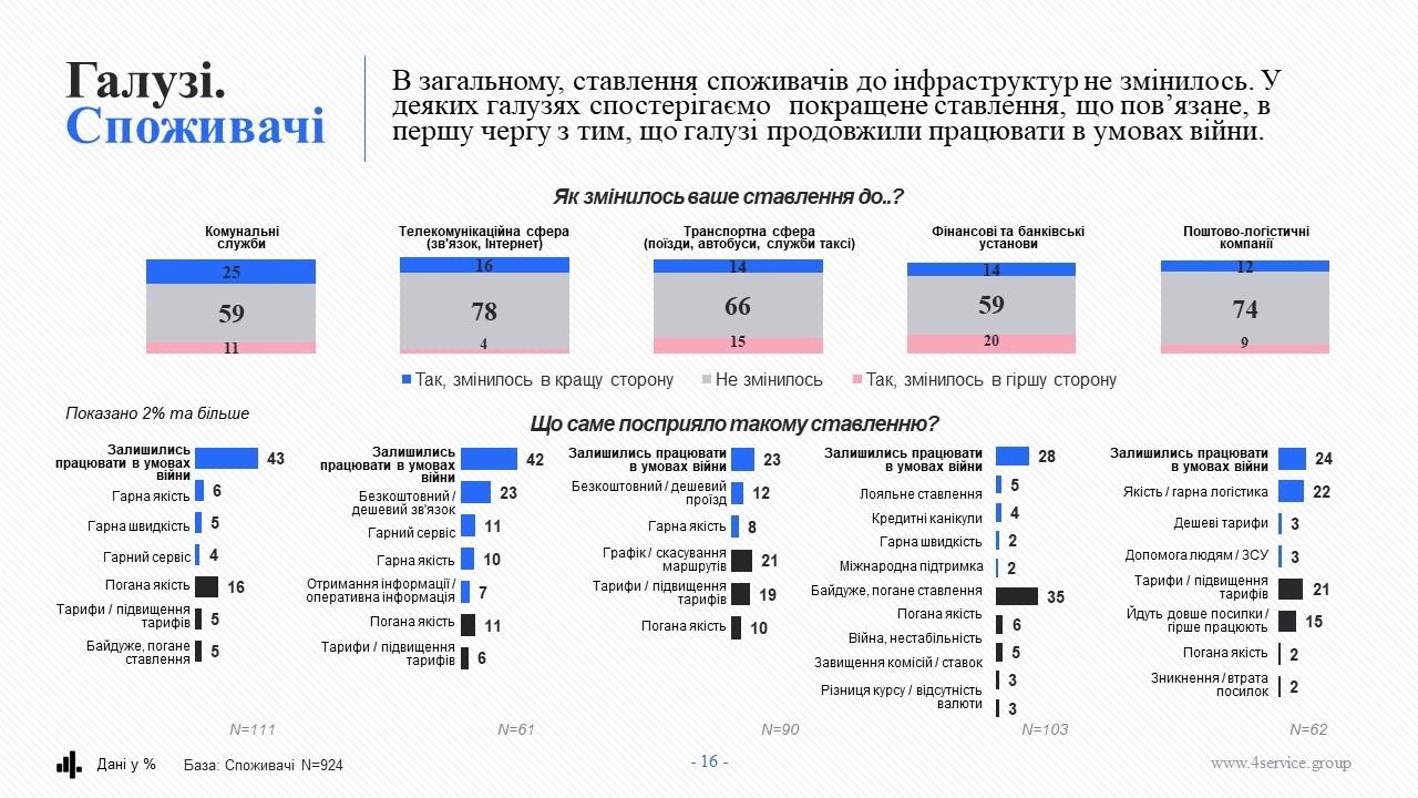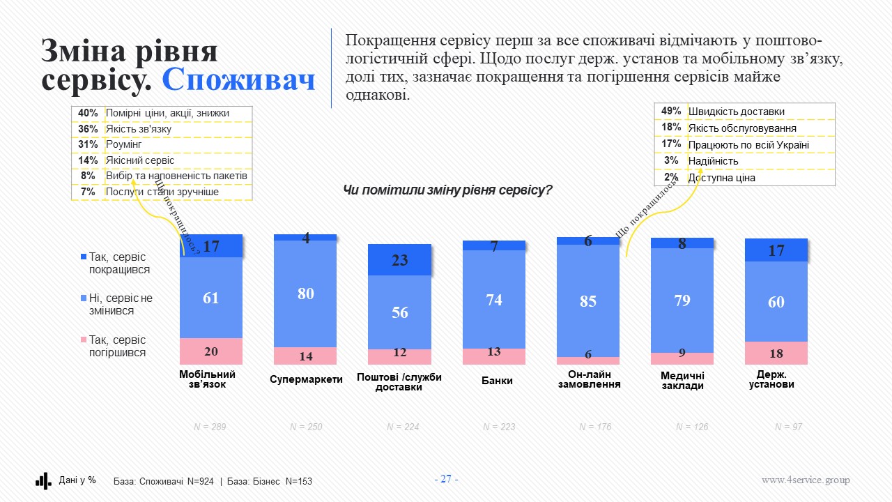 За час повномасштабної війни покращення сервісу українські споживачі найчастіше відмічають у поштово-логістичній сфері — 23% опитаних відзначили позитивні зміни. Оцінки якості послуг державних установ, медичних закладів та операторів мобільного зв’язку виявилися досить неоднозначними. Про покращення й погіршення їхнього сервісу висловилися майже однакова кількість респондентів. Так, наприклад, 20% опитаних вважають, що сервіс мобільних операторів став гіршим, бо значно зросли тарифи, а альтернатив звичним тарифним планам немає (поганий асортимент).