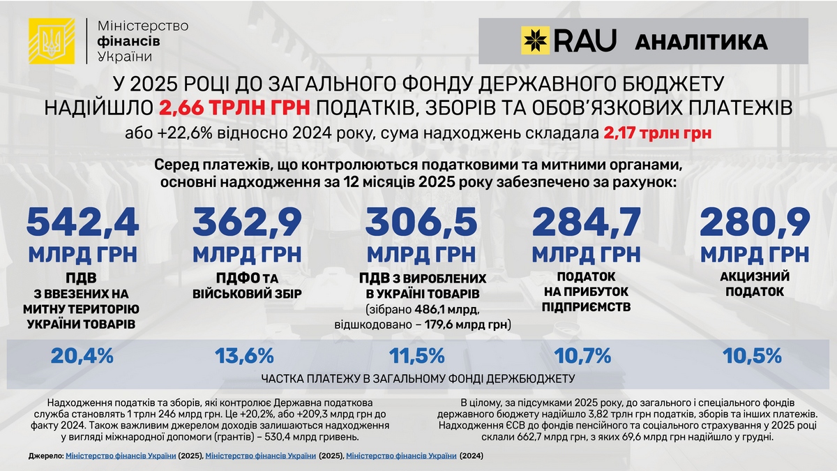 Згідно з повідомленням Міністерства фінансів України, в 2025 році до загального фонду державного бюджету надійшло 2,66 трлн грн податків, зборів та обов’язкових платежів. Це на 22,6% більше порівняно з 2024 роком, коли сума надходжень складала 2,17 трлн грн.