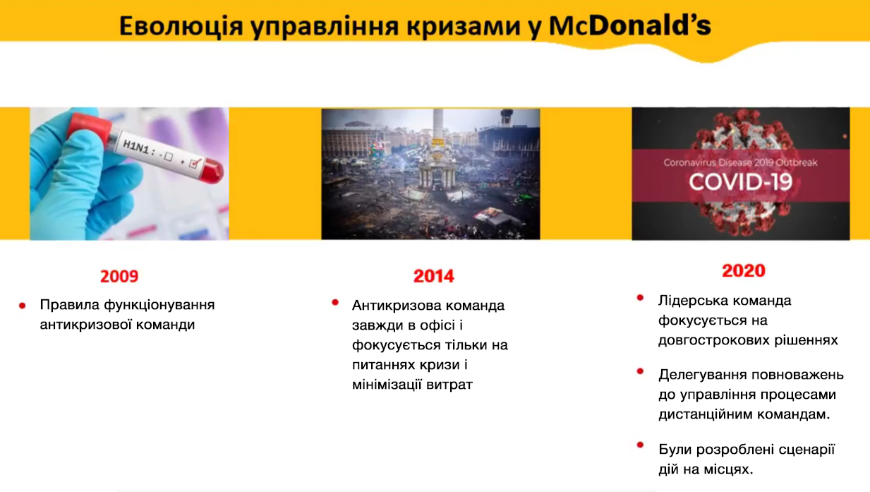 Криза 2014 року дуже вплинула на роботу наших ресторанів – частина з них були в епіцентрі подій в центрі Києва, а ще частина опинилась на окупованій території. У той період антикризова команда вже фокусувалась на швидкому прийнятті рішень, вирішенні нагальних питань, пов’язаних з кризою, поширенні інформації та мінімізації втрат.