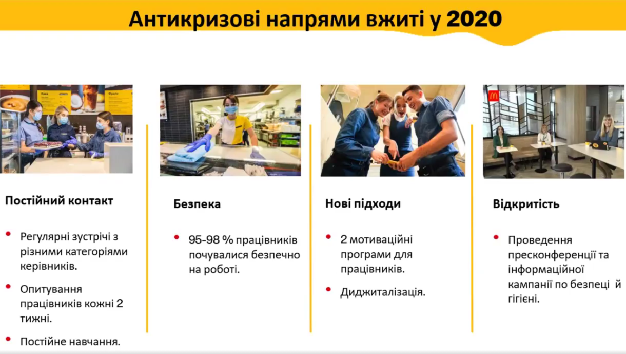 На початку першого локдауну керівництво корпорації сформулювало п’ять принципів, якими McDonald’s має керуватися при прийнятті рішень. В Україні це відобразилось у чотирьох пріоритетах, яких ми дотримуємось і зараз:
