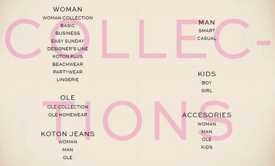 Щороку рітейлер випускає 30 000 одиниць нових товарів – це 50 колекцій за рік. Цільову аудиторію компанії складають жінки від 25 до 35 років, які цікавляться модою. Під брендом Ole, Koton випускає колекції для молодіжної аудиторії від 15 до 25 років. Крім жіночих колекцій, бренд випускає і чоловічу лінію – casual man і business man, а також дитячі колекції.
