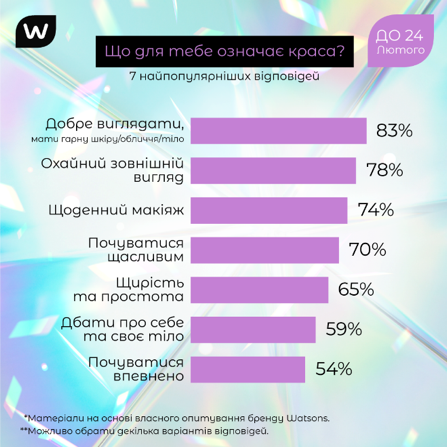 Краса – глибша за зовнішність. Kpaca – це спосіб життя, сповнений любові, турботи про себе та оточуючих, доброту й піклування про фізичне та ментальне здоров’я. Це виглядати добре, зі щирою повагою до планети та майбутніх поколінь. Це робити добро, з позитивом, який надає сили іншим. Прекрасне самопочуття, що сяє зсередини. В Watsons ми віримо в красу, яка корисна всім і кожному – розуму, тілу та душі.