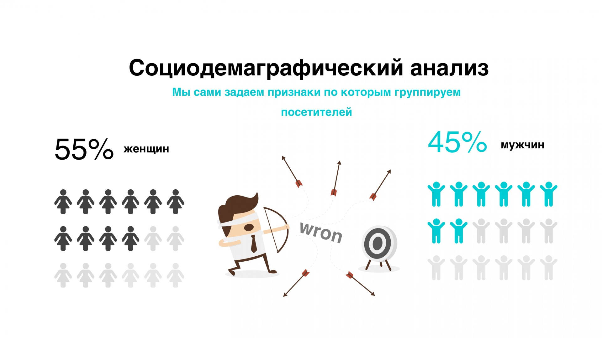 Звичайна практика подібного роду досліджень полягає в тому, що відвідувачі сегментуються за соціально-демографічними характеристиками – стать, вік, освіта, рівень доходу. Ці ознаки дослідник задає сам і з самого початку зрозуміло які групи споживачів будуть в результаті. Насправді цей аналіз вже не дає повного уявлення про те, як люди поводяться в торговому центрі. Зараз на поведінку людей впливає величезна кількість чинників: наявність активностей, інтернет, якірні орендарі та багато інших.
