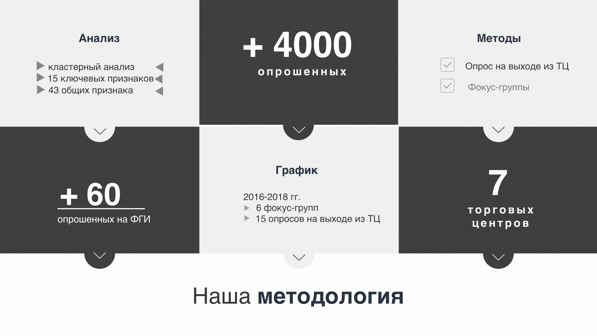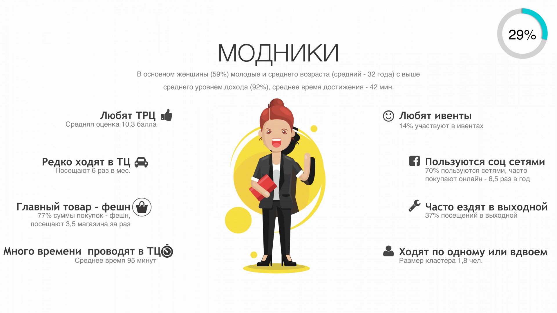 Аналіз здійснювався на основі 15 ключових характеристик і більш ніж 40 спільних, на базі 15 хвиль опитувань на виході з ТРЦ за останні два роки. В результаті аналізу ми отримали групи, які відрізнялися один від одного за низкою ключових характеристик і вже потім ми давали їм якісь назви.