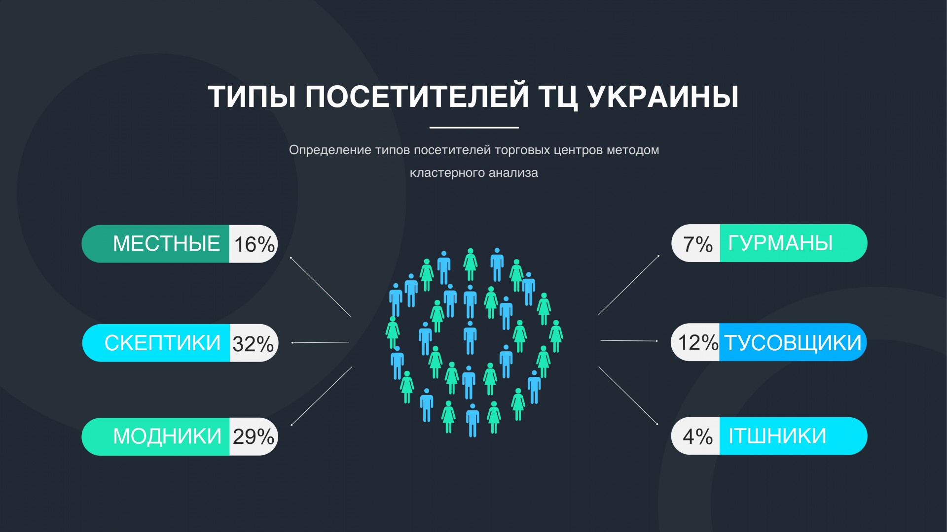 Ми довго думали, як же згрупувати відвідувачів так, щоб ця сегментація була корисною, могла практично застосовуватися і грунтувалася не так на соц-дем характеристиках, як на поведінкових. У підсумку ми вирішили використовувати кластерний аналіз, який дозволяє автоматично групувати людей зі схожою поведінкою і схожими характеристиками в кластери. Тобто на старті дослідження ми не розуміли, які кластери отримаємо в результаті. Основною базою для такого аналізу був величезний масив даних, який ми накопичили за роки роботи наших торгових центрів. Також частково використовували масиви даних, якими володіє URB.