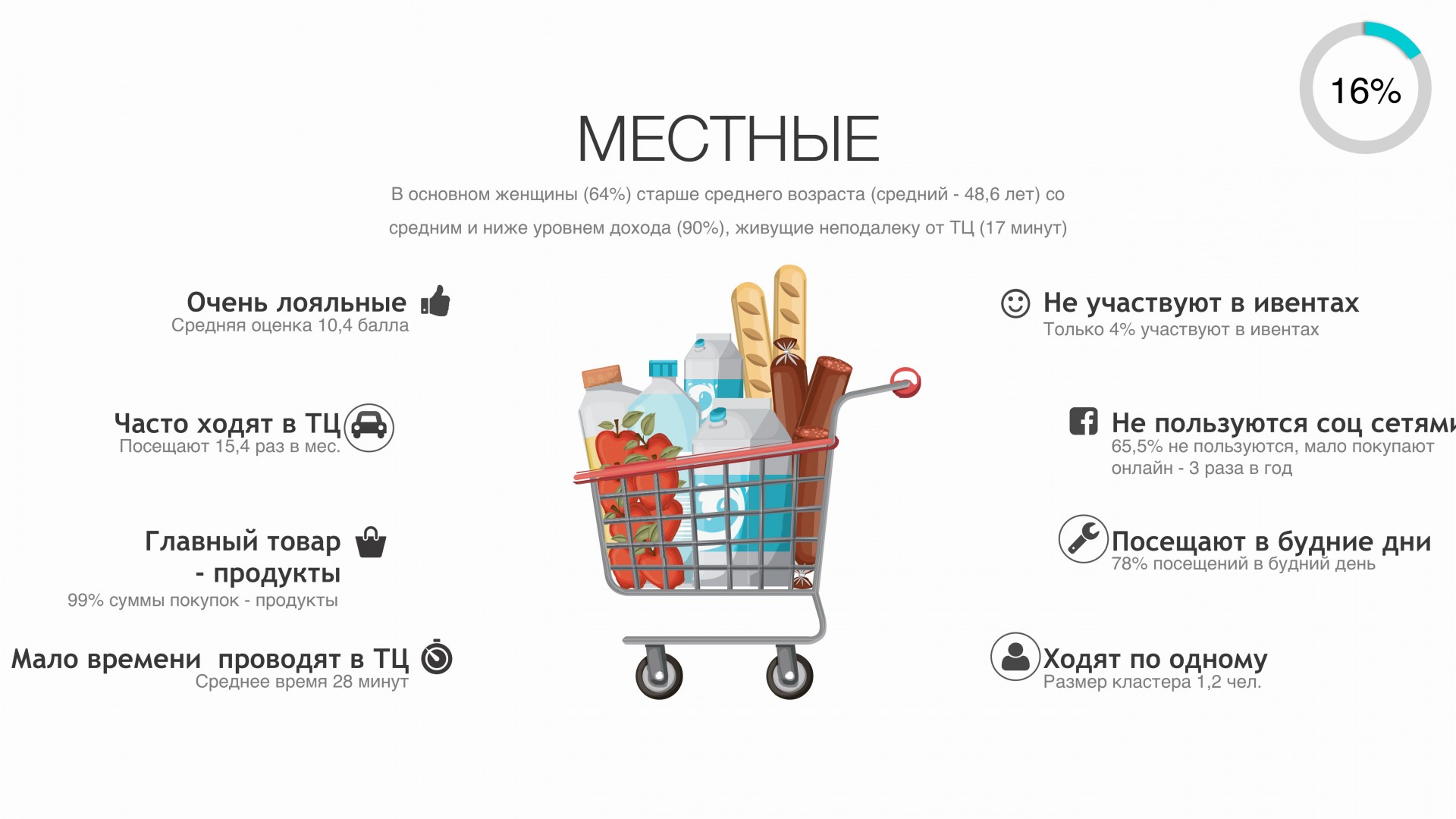 Перша група – «місцеві». Тут об’єднані люди, які проживають найближче до торгового центру і витрачають найменше часу на дорогу до нього. Крім того, вони схожі за низкою інших поведінкових характеристик. В основному це жінки від 40 років, із середнім рівнем доходу. Ці люди дуже лояльні до торгового центру, і найчастіше його відвідують – близько 15 разів на місяць. Зазвичай вони купують товари повсякденного попиту, на них вони витрачають майже 99% грошей. Вони не проводять багато часу в ТЦ, практично не приймають участь в заходах і рідко користуються соцмережами або інтернетом.