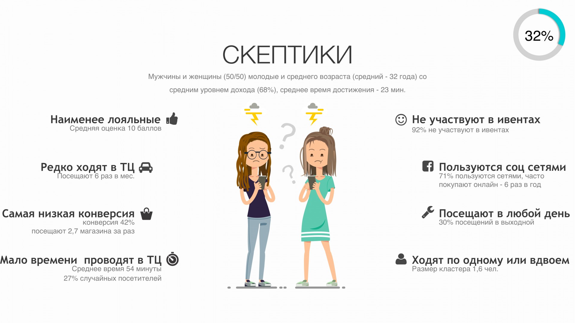 Наступна група, яка утворилася шляхом кластерного аналізу – це «скептики». Таких у нас вийшло 32%. Ця група найгірше оцінює торгові центри. Люди з цієї групи рідко ходять в ТРЦ, приблизно шість разів на місяць, і у них найнижча конверсія. В середньому людина з цієї групи заходить в три магазини при відвідуванні ТРЦ і дуже мало купує.