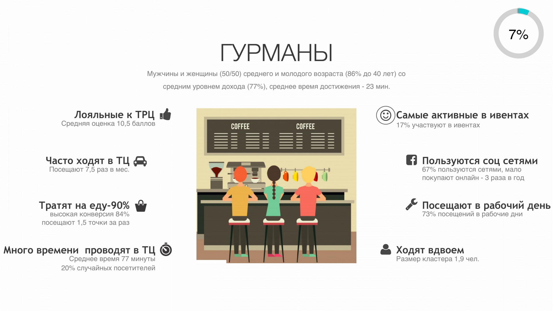 Група «гурмани» становить приблизно 7% від загального числа відвідувачів. Рівною мірою тут представлені як чоловіки, так і жінки. В основному це люди до 40-ка із середнім рівнем достатку. Ми назвали їх гурманами, тому що вони ходять в ТРЦ щоб відвідати ресторани, кафе або фуд-корт. 90% грошей, які вони витрачають в ТРЦ, припадає на заклади громадського харчування. Вони досить лояльні до торгового центру, часто в нього ходять як в будні, так і у вихідні дні.
