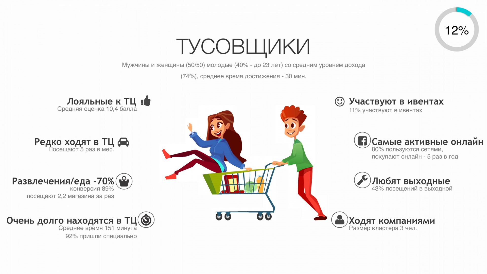 «Тусовщики» – наймолодша і дуже активна в торговому центрі група – таких людей близько 12%. Вони відрізняються від попередньої групи «гурманів» тим, що витрачають не тільки на їжу, але ще і на розваги – загалом близько 70% грошей. Також ця група перебуває в ТРЦ найдовше – приблизно 2,5 години, бере участь в івентах, дуже активна онлайн і любить відвідувати ТЦ у вихідні.
