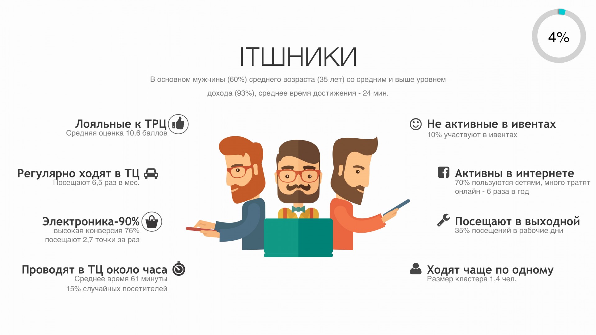 Ну і остання група – «айтішники». Ми довго думали, чи варто її виділяти в окремий кластер, тому що вона досить нечисленна – всього 4%. Тим не менш, вона дуже однорідна і має свої яскраво виражені характеристики, які її відрізняють від інших. Назва групи не означає, що всі ці люди за професією IT-фахівці. Просто вони люблять гаджети, техніку, і все що пов’язано з цифровим світом. Більша частина цієї групи – чоловіки до 40 років із середнім рівнем достатку. Як правило, вони лояльні до торгового центру і відвідують його регулярно, а 90% грошей, які вони залишають у торговельному центрі, витрачають на електроніку. Відвідувачі з цієї групи проводять в торговому центрі близько години, їх не цікавлять івенти, але вони дуже активні в інтернеті та соціальних мережах.