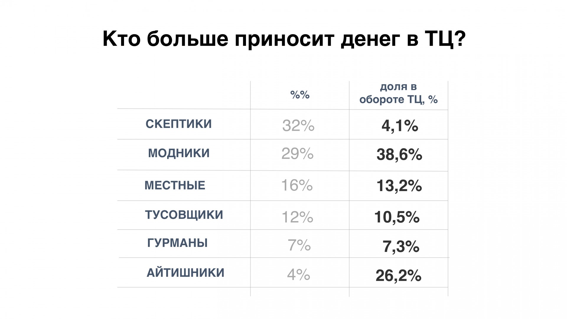 Найцікавіше – хто з них витрачає в торговому центрі більше грошей. Як виявилося, найбільше продажів ТРЦ приносять модники. Їх частка в обороті ТРЦ – майже 40%. Найменше грошей приносять скептики, які є найбільшою за чисельністю групою. Ця група – майже третина відвідувачів ТРЦ – забезпечує всього 4,1% від усіх продажів. Це група з низьким рівнем доходу, яка дуже вибірково підходить до своїх покупок і мало витрачає в торговому центрі. Найцікавіше, що найменш численна група – «айтішники» – забезпечує понад чверть всього обороту ТРЦ. Для нас це було несподіванкою. Але насправді це можна пояснити – вони купують дорогі речі і роблять це часто. Думаю, що цей сегмент буде рости як в кількості, так і в обороті. Інші групи відвідувачів ТРЦ займають частку в обороті приблизно пропорційну своїм розміром.