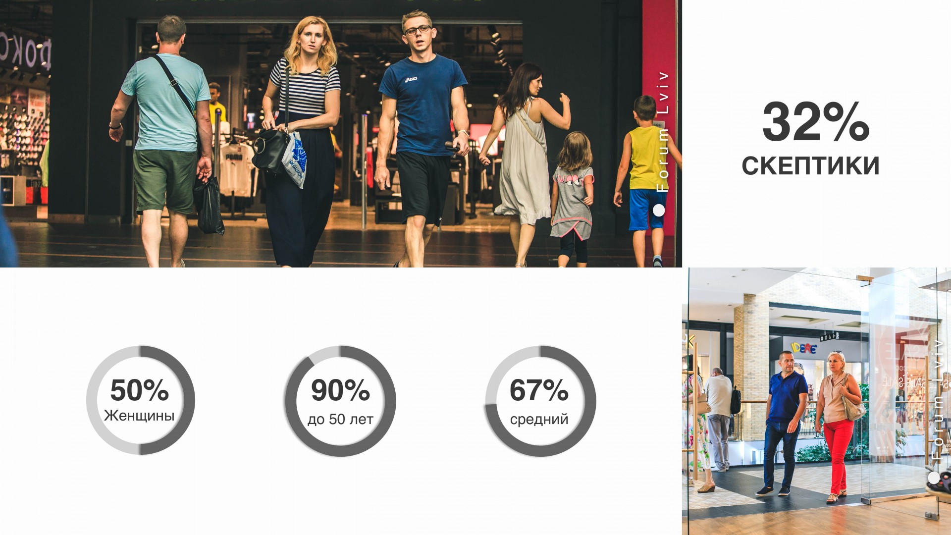 Наступна група, яка утворилася шляхом кластерного аналізу – це «скептики». Таких у нас вийшло 32%. Ця група найгірше оцінює торгові центри. Люди з цієї групи рідко ходять в ТРЦ, приблизно шість разів на місяць, і у них найнижча конверсія. В середньому людина з цієї групи заходить в три магазини при відвідуванні ТРЦ і дуже мало купує.