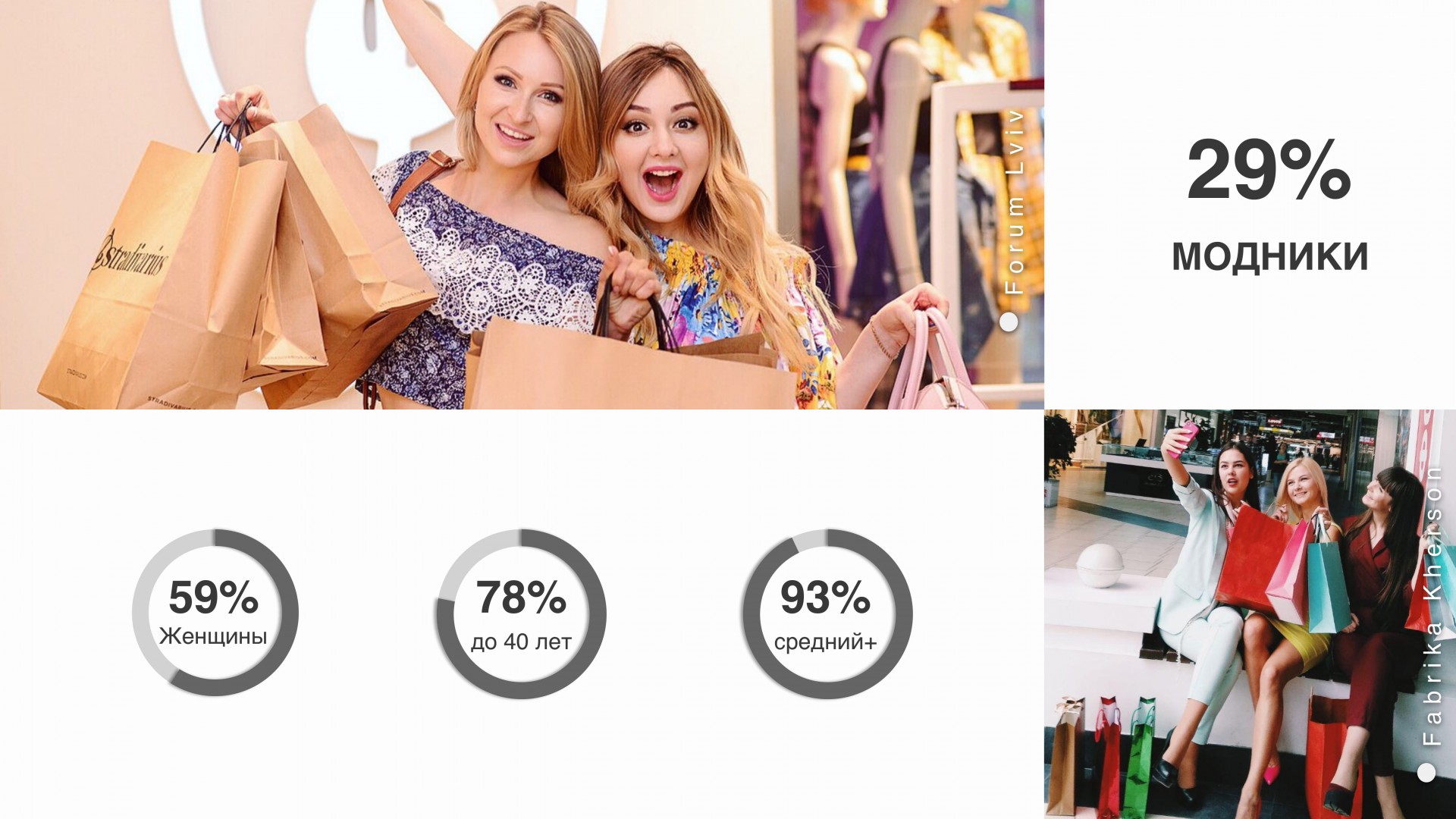 Третя група – це люди, які найбільше витрачають на fashion. Ми їх назвали «модники». Більшість в цій групі – жінки, в основному молоді та середнього віку з доходом вище середнього. Ця група людей дуже лояльна до ТРЦ, але ходить в них нечасто – в основному у вихідні дні. Головний товар, який вони купують – одяг, взуття та аксесуари. Вони відвідують найбільшу кількість магазинів за візит ТРЦ – майже 4. Також у них досить високий відсоток конверсії. У торговому центрі вони проводять більше 1,5 годин. Ця група любить івенти, користується соцмережами, бачить рекламу в інтернеті та активно купує онлайн.