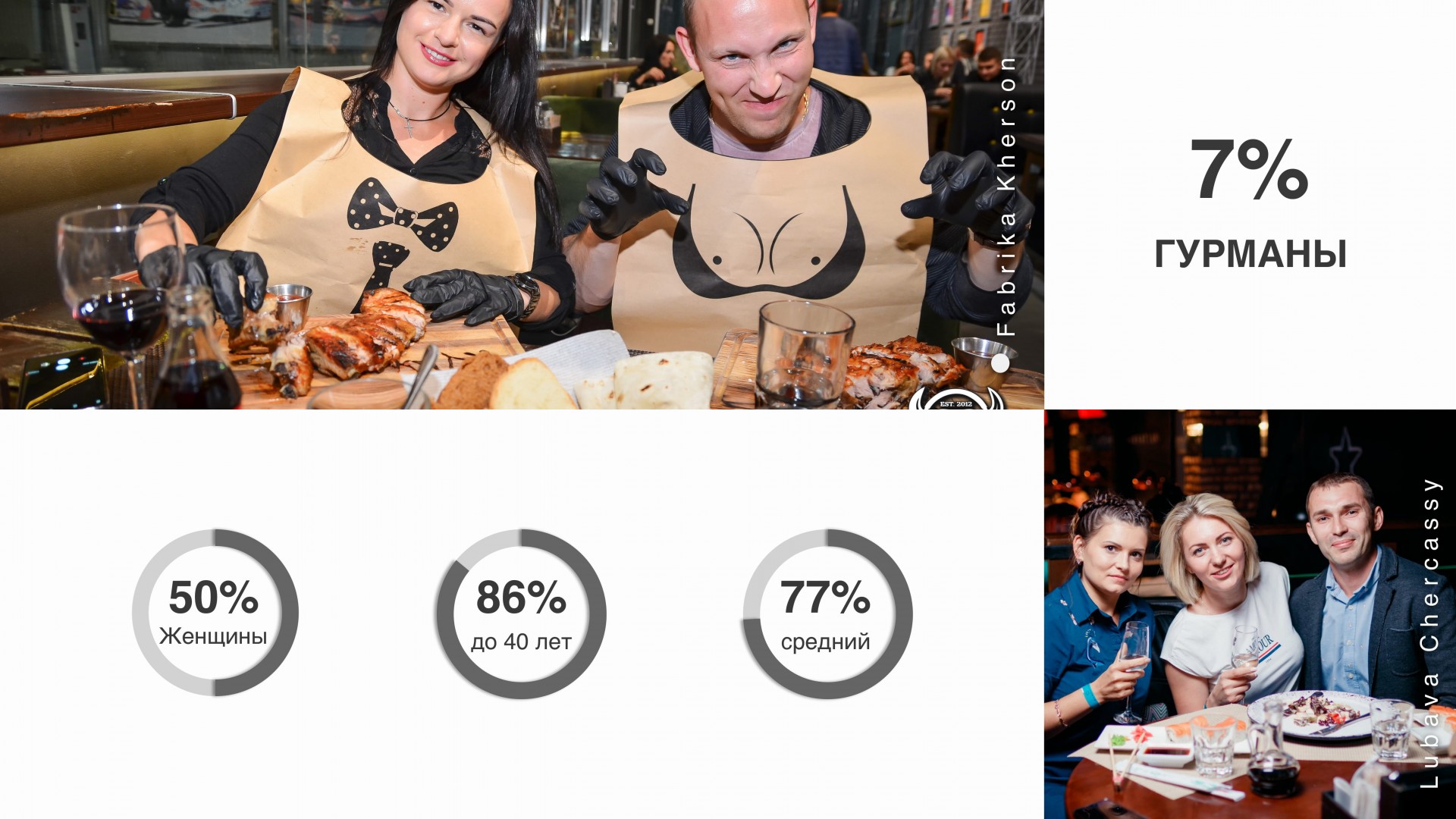 Група «гурмани» становить приблизно 7% від загального числа відвідувачів. Рівною мірою тут представлені як чоловіки, так і жінки. В основному це люди до 40-ка із середнім рівнем достатку. Ми назвали їх гурманами, тому що вони ходять в ТРЦ щоб відвідати ресторани, кафе або фуд-корт. 90% грошей, які вони витрачають в ТРЦ, припадає на заклади громадського харчування. Вони досить лояльні до торгового центру, часто в нього ходять як в будні, так і у вихідні дні.
