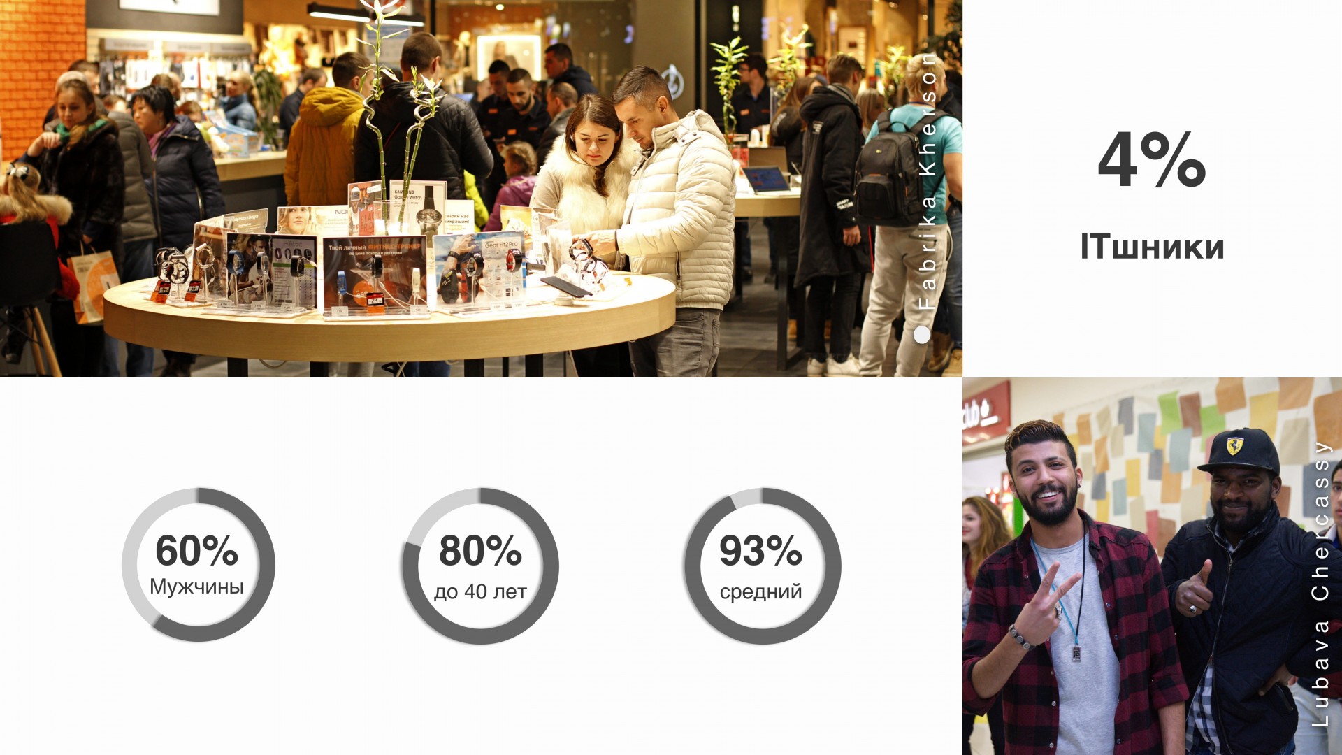 Ну і остання група – «айтішники». Ми довго думали, чи варто її виділяти в окремий кластер, тому що вона досить нечисленна – всього 4%. Тим не менш, вона дуже однорідна і має свої яскраво виражені характеристики, які її відрізняють від інших. Назва групи не означає, що всі ці люди за професією IT-фахівці. Просто вони люблять гаджети, техніку, і все що пов’язано з цифровим світом. Більша частина цієї групи – чоловіки до 40 років із середнім рівнем достатку. Як правило, вони лояльні до торгового центру і відвідують його регулярно, а 90% грошей, які вони залишають у торговельному центрі, витрачають на електроніку. Відвідувачі з цієї групи проводять в торговому центрі близько години, їх не цікавлять івенти, але вони дуже активні в інтернеті та соціальних мережах.