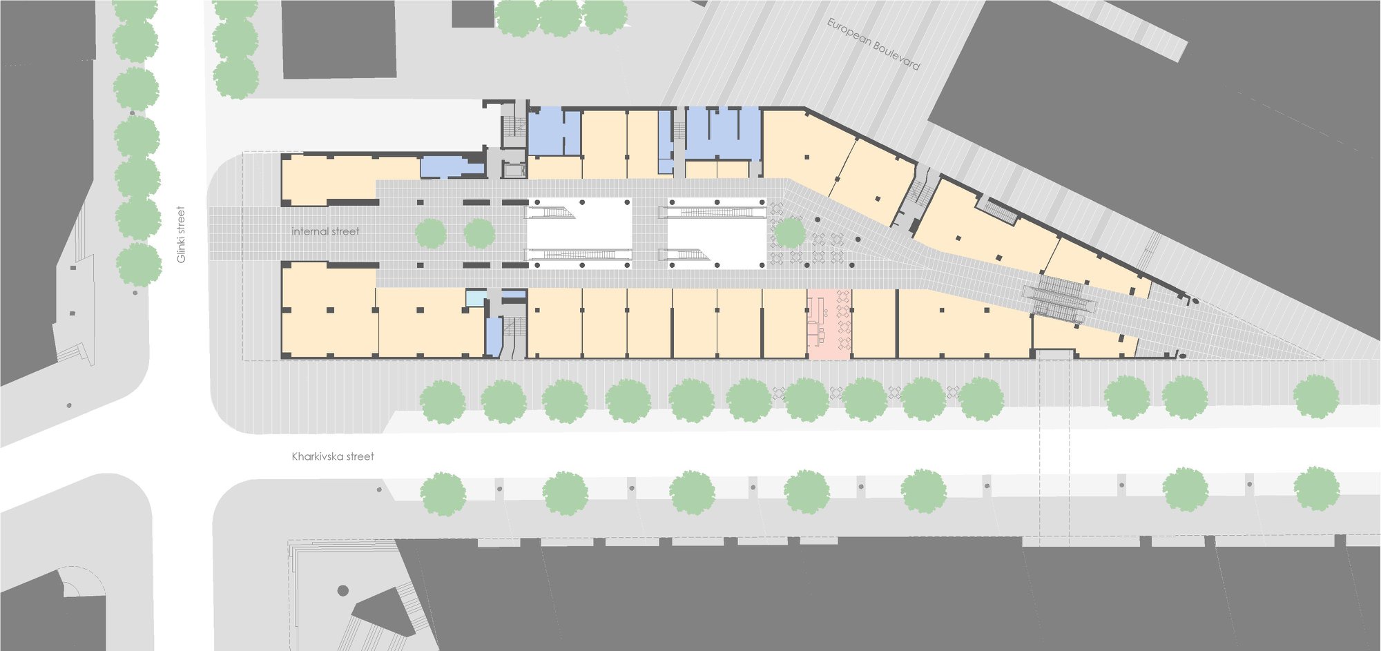 Нижні три поверхи займатимуть роздрібні магазини, вестибюль офісної частини, кафе, офісні приміщення різної планувальної структури – open space, со-working, окремі офіси.