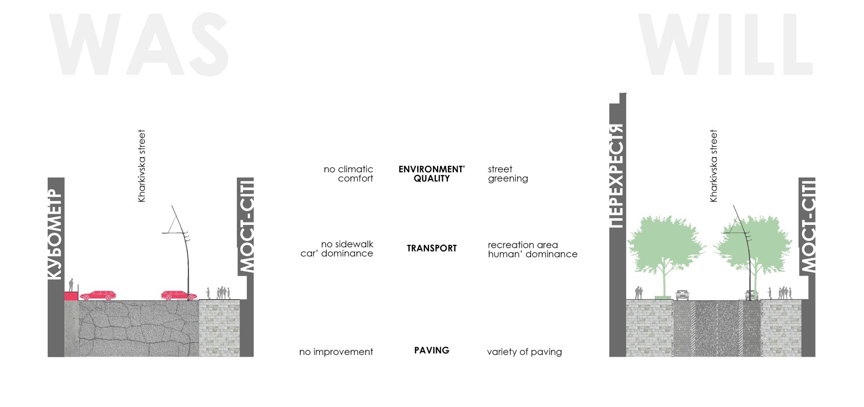 Також проект передбачає благоустрій вулиці Харківська. Тут приведуть до ладу паркувальні місця, облаштують велодоріжки, висадять дерева, створять зону відпочинку та літні майданчики.