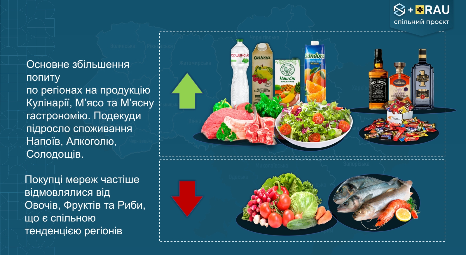 Загалом практично у всіх, окрім Києва, регіонах зріс попит на продукцію кулінарії, м’ясо та м’ясну гастрономію. Тобто тільки в столиці ще продовжують в основному готувати вдома. Найчастіше українці відмовлялися від овочів, фруктів та риби, що є спільною тенденцією для всіх регіонів.