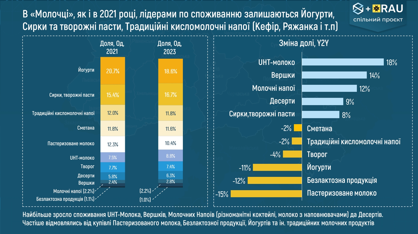 Якщо казати про лідерів продажів у кількісному вираженні, то в топі споживання лишаються молочні продукти. Порівняно з 2021 роком у 2023-му структура споживання в категорії молочних продуктів практично не змінилася. Але в цьому році спостерігається перехід на продукти довготривалого зберігання. Зокрема, падіння купівлі звичайного пастеризованого молока та зростання продажів ультрапастеризованого. Частка пастеризованого молока скоротилася на 15%. Так само зменшилося споживання безлактозної продукції та всієї традиційної кисломолочної групи – сметани, кефіру, ряжанки та йогуртів. Натомість частіше почали купувати вершки, молочні напої (коктейлі, молоко з наповнювачами) та десерти (сирки та творожні пасти).
