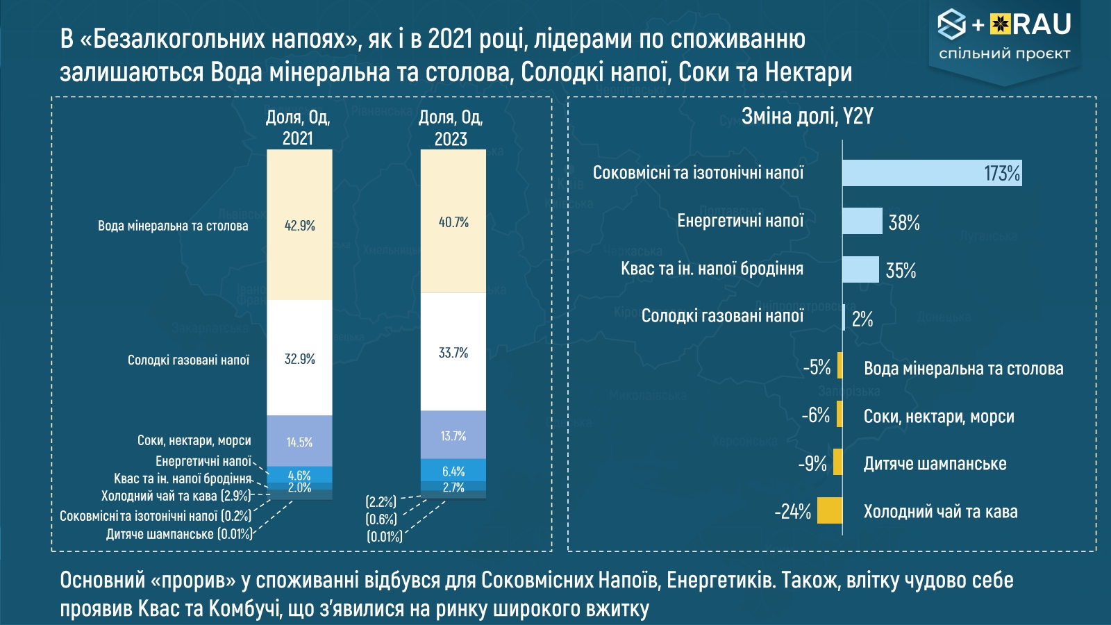 У безалкогольних напоях структура продажів залишається звичною. На першому місці – вода, другому – солодка вода, третьому – соки, напої, нектари. Хоча наразі зросла категорія соковмісних напоїв, які виготовляють на основі мінеральної води і натурального соку. Проте збільшення частки даної категорії на 173% майже не вплинуло на загальний розподіл ринку, оскільки сама частка була дуже невелика й нині складає 0,6% всіх продажів напоїв в Україні. Також приріст у продажах на 38% показали енергетики та напої бродіння (квас, комбуча), які додали у своїй частці 35%. Варто також відзначити, що тепер квас стає більш схожим на натуральний напій бродіння аніж на солодкий газований напій.