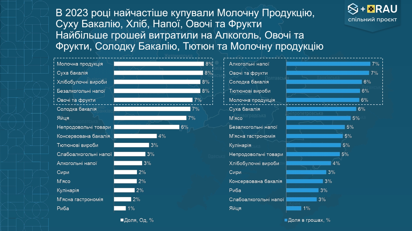 Під час повномасштабної війни, так само як і до її початку, топ-5 товарів (або приблизно 40%) у кошику споживача займають молочна продукція, суха бакалія, хліб, напої, овочі та фрукти. Але найбільше грошей (трохи більше третини коштів) українці витрачають на дещо інші п’ять позицій: на алкоголь, овочі та фрукти, солодку бакалію, тютюн та молочну продукцію.