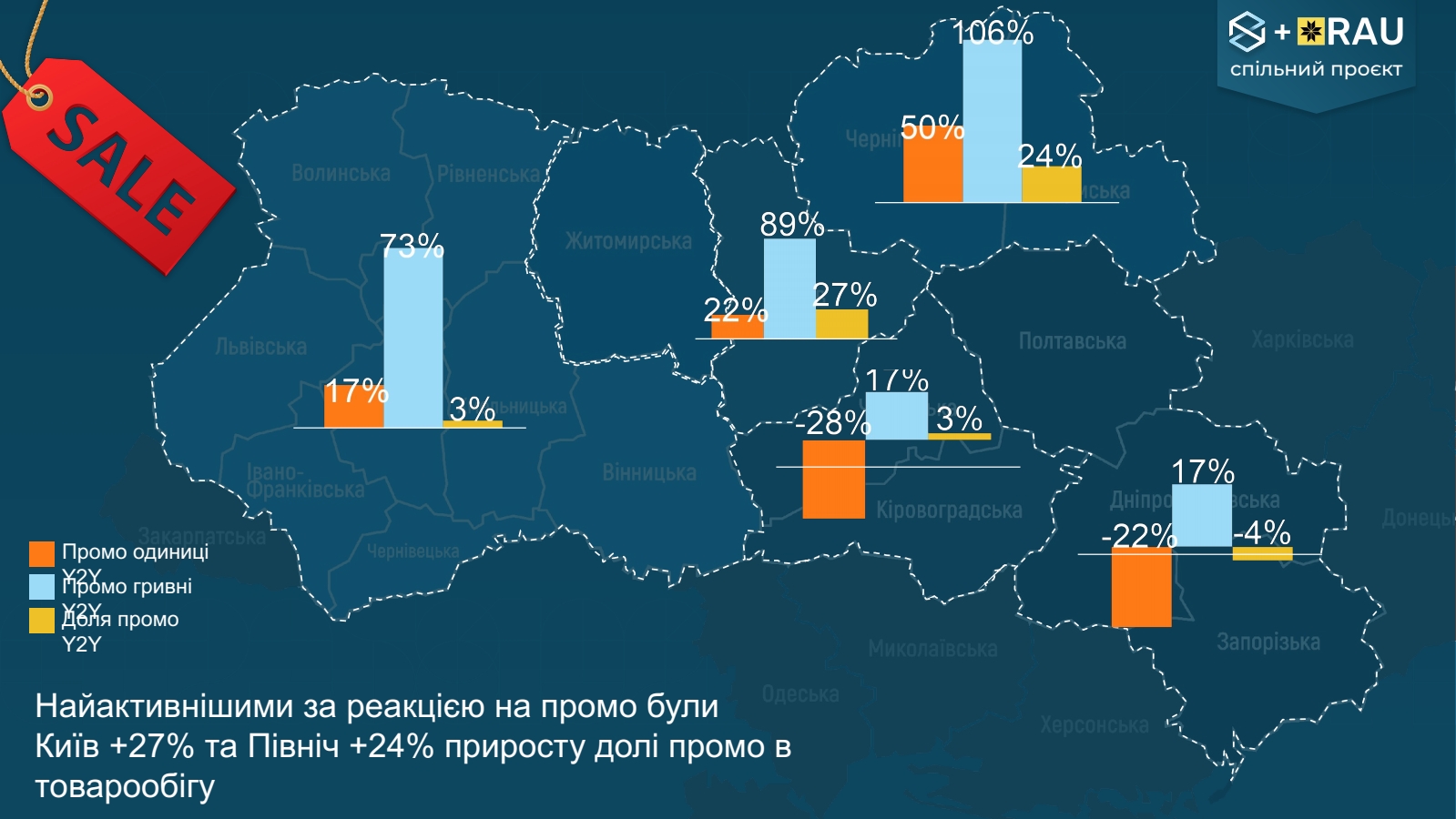 Якщо подивитися на продаж акційних товарів, помітне збільшення промо-активності відбулося на заході, в Києві та на півночі країни: від 70% до 106%. Найактивнішими за реакцією на промо були Київ та північ, де частка промо в товарообігу рітейлерів приросла на 27% та 24% відповідно у порівнянні з 2021 роком.