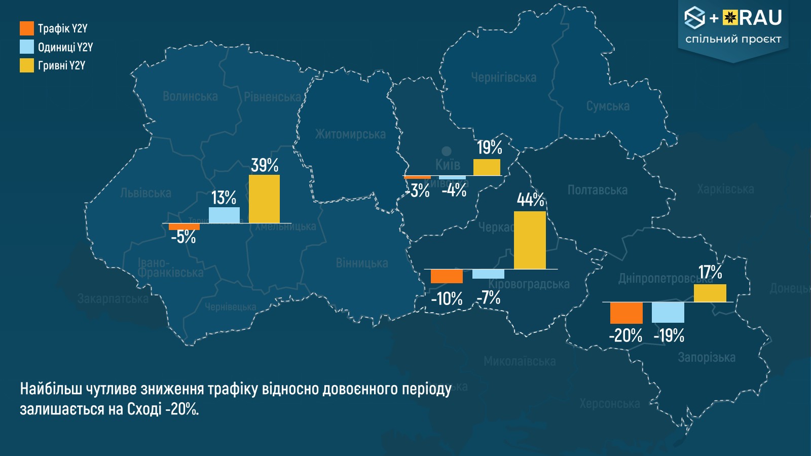 Очікувано, найбільше втратили покупців магазини на сході, де падіння трафіку фіксується нині на рівні 20% до довоєнного періоду. В центрі цей показник падіння удвічі менший, а збільшення трафіку фіксується тільки у північних областях (+8%), тому тут і росте виторг (+49%). На відміну від інших регіонів, на заході країни при падінні трафіку на 5% купують більше товарів (+13%).