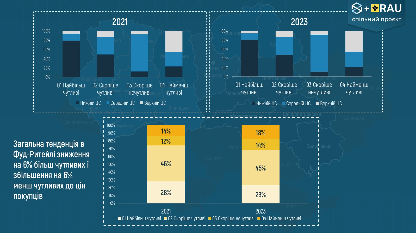 В 2023 році стався важливий зсув у сприйнятті споживачами ціни товару. Так, за результатами дослідження кількість більш чутливих до вартості товару людей скоротилася на 6%. Відповідно, побільшало тих, хто майже не зважає на ціну при покупці потрібного продукту. Причому ці зміни сталися саме серед тих, для кого ціна була надважливою (скорочення частки з 28% до 23%).