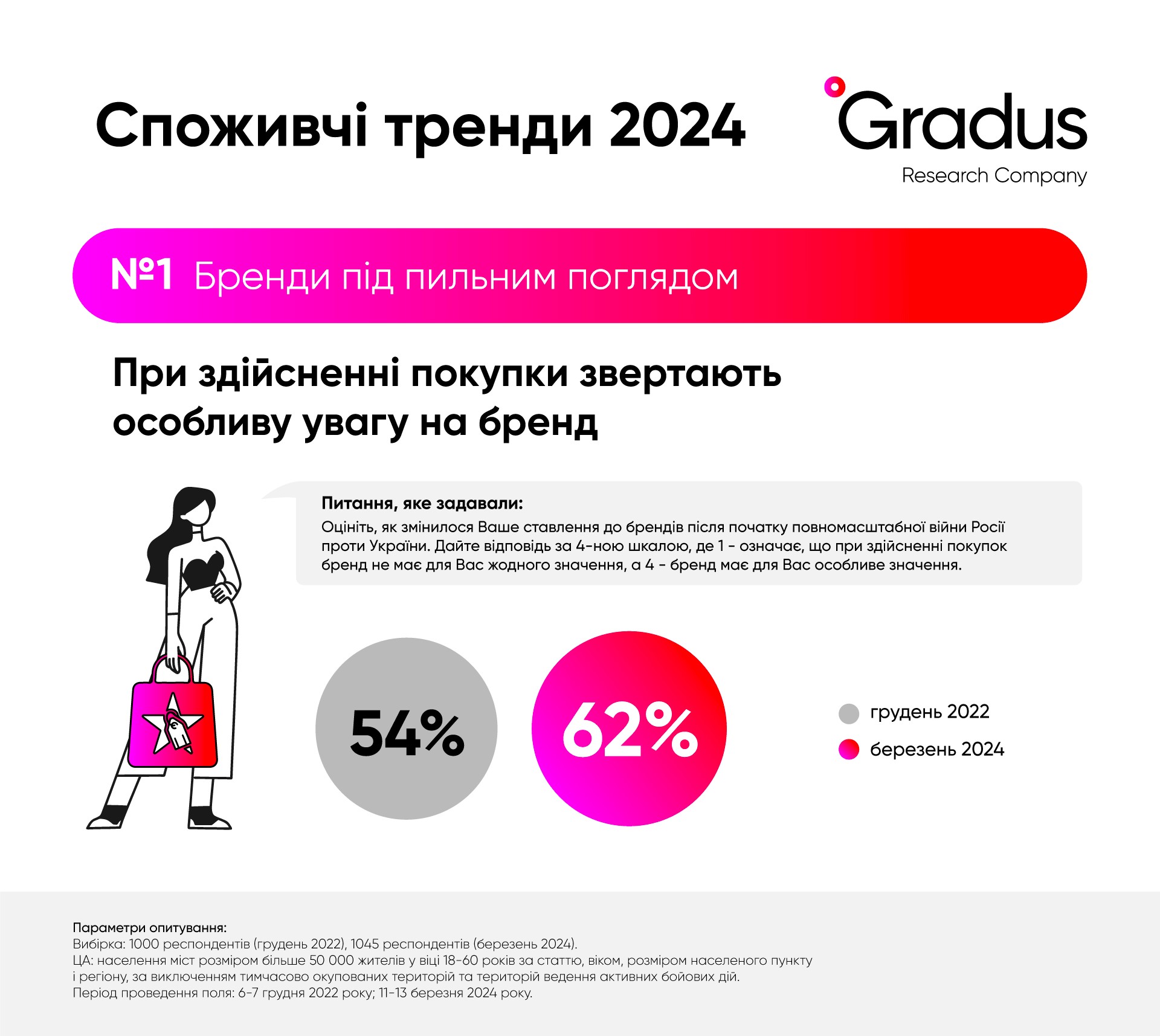 Довідка. Дослідження проведене дослідницькою компанією Gradus Research методом самозаповнення анкети в мобільному додатку Gradus. Вибірка відображає структуру населення міст з кількістю мешканців більше 50 000 у віці 18-60 років за статтю, віком, розміром населеного пункту та регіоном, за виключенням тимчасово окупованих територій та територій ведення активних бойових дій. Період проведення: 11-13 березня 2024 року. Розмір вибірки: 1045 респондентів.
