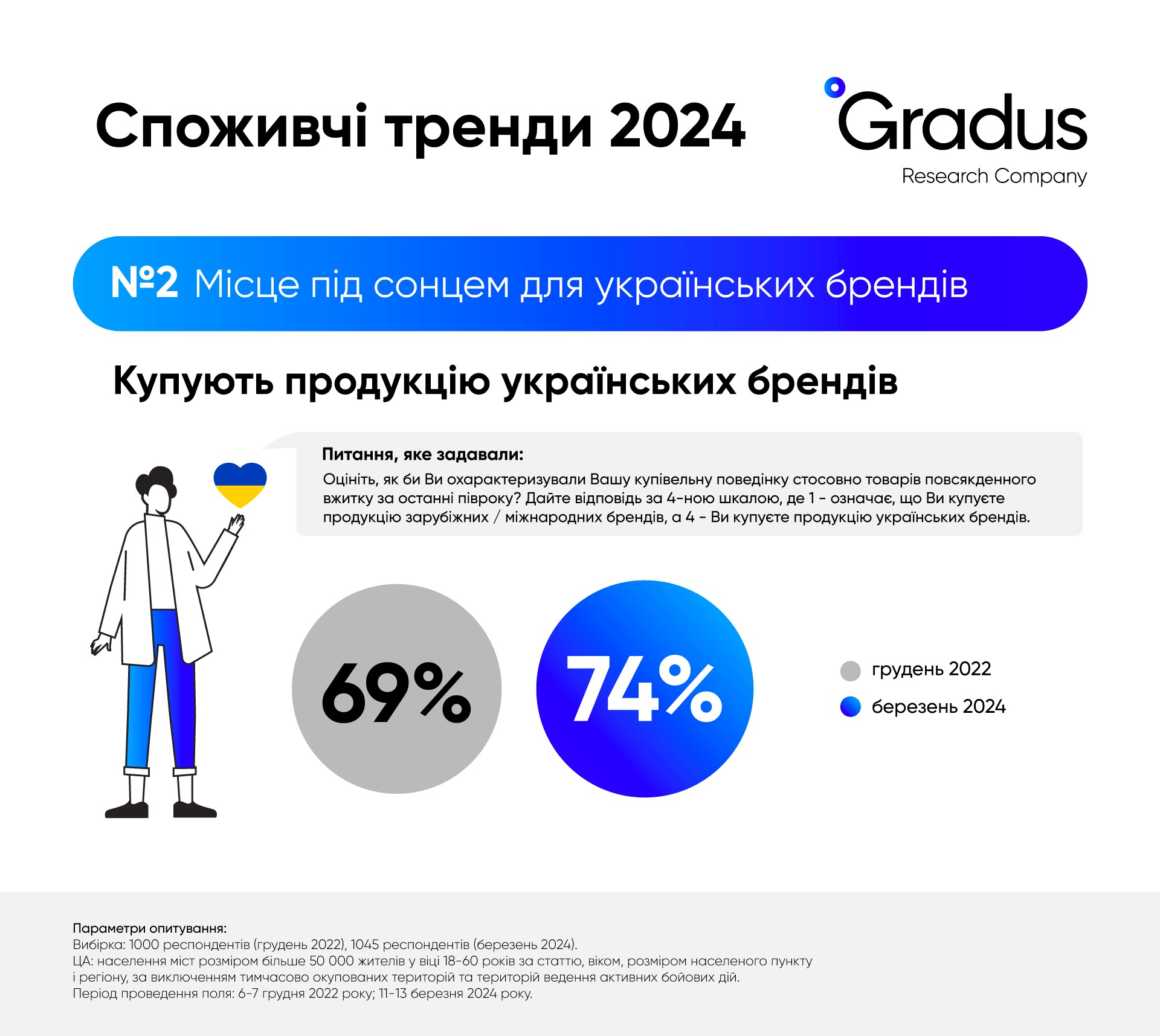 Це все конвертується у зростаючу прихильність до українських брендів перед іноземними. Якщо у грудні 2022 року тренд лише набирав обертів, і про купівлю товарів та послуг українських виробників заявляли 69% опитаних, то зараз частка таких респондентів зросла до 74%.