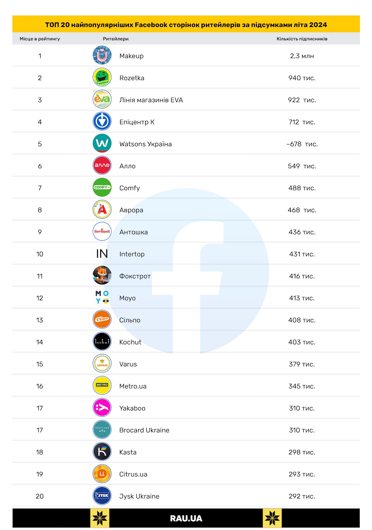 Більшість ритейлерів збільшила кількість підписників на 1-2 тисячі, за виключенням бренду Kochut, який натомість втратив 1000 фоловерів, а також Makeup, Watsons Україна та Yakaboo, у яких розмір аудиторів у Facebook не змінився.